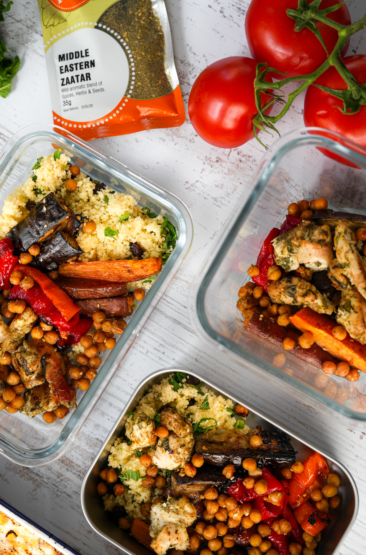 - Divide cous cous mix into containers, top with roast vegetables and sliced chicken.