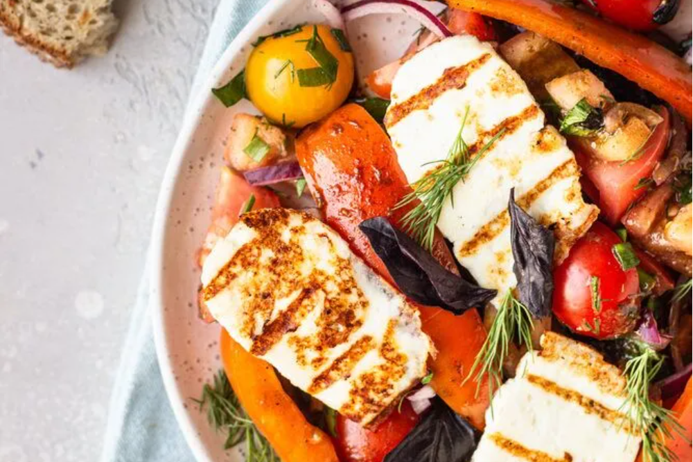 - Remove from the oven and place your halloumi slices on top in a single layer with a drizzle of olive oil and place under the grill for a further 5 minutes, or until the cheese is nice and golden. Serve alongside some tortillas, brown rice, or a fresh green salad and enjoy!
