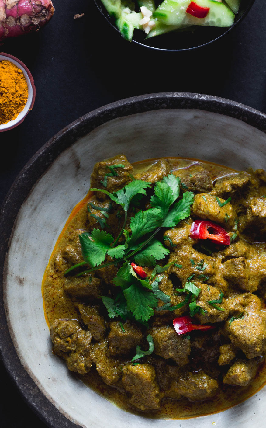When thinking of Malaysian curry, no one can go past the Rendang. However, it is hotly contested as to whether Rendang is of Indonesian or Malaysian origin. Regardless, in both countries, it has become a national treasure. Rendang is a tender, slightly more dry curry filled with slow-cooked beef, punchy herbs, spices, and warm toasted coconut. As with most Southeast Asian curries, a good spice blend is vital and the foundation to good Rendang. Dried chillies add a raisin-like flavour and intense heat, whilst kaffir lime leaves add a tang, galangal and turmeric, an earthy hum, and cloves and cumin a warm sweetness along with many other flavourful additions.